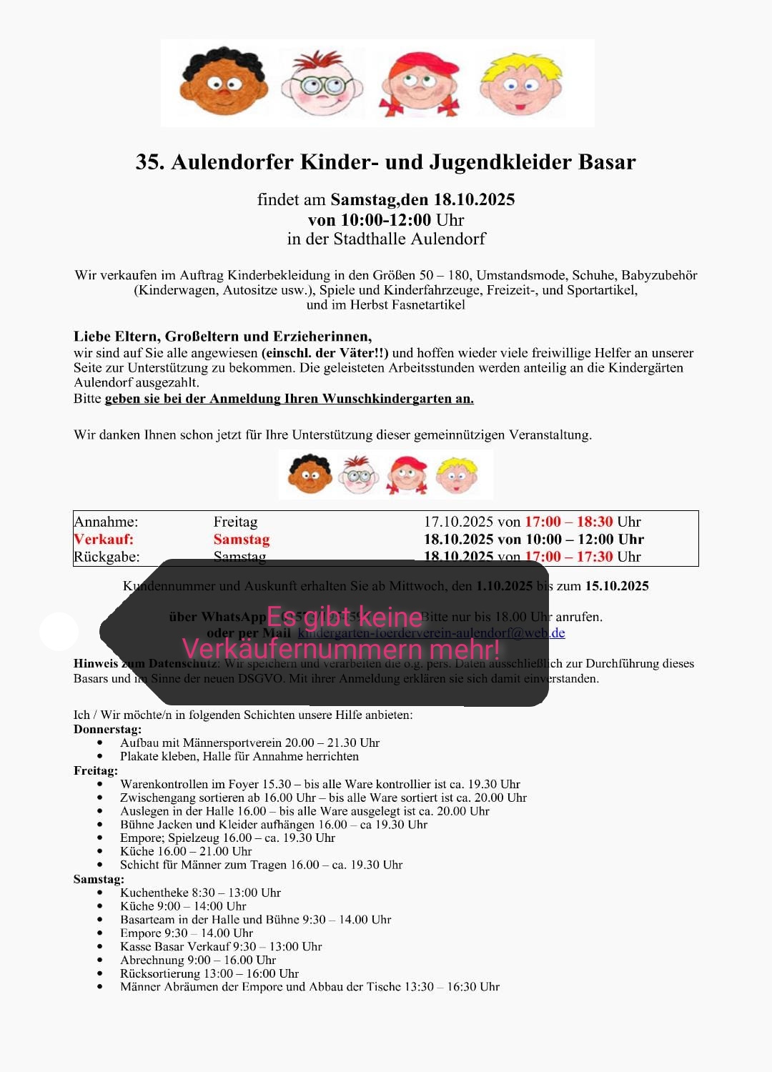 Zwei Mal im Jahr veranstaltet der Kindergarten-Förderverein Aulendorf e.V. einen Kinderkleiderbasar. Der Gewinn der Basare kommt den Aulendorfer Kindergärten zugute.